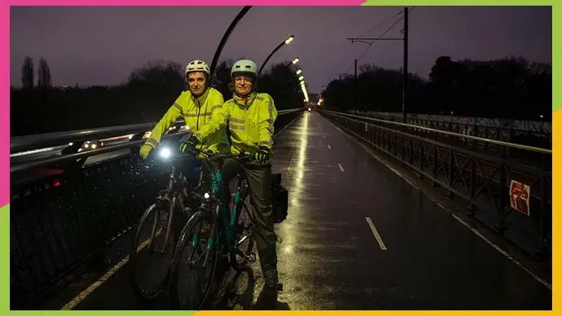 Francine : J'ai investi dans un bon équipement pour l'hiver : tee-shirt en laine mérinos, chaud mais non transpirant, veste technique et veste jaune. Je mets des grosses chaussettes, toujours en mérinos, et un pantalon de Kway qui couvre mes chaussures. Et bien sûr, bonnet, cache-col et gants ! J'ai la chance d'avoir un vestiaire au travail, où je me change en arrivant. J'ai aussi choisi un éclairage dans le moyeu du vélo : je suis sûre d'être éclairée tout le temps, sans y penser.