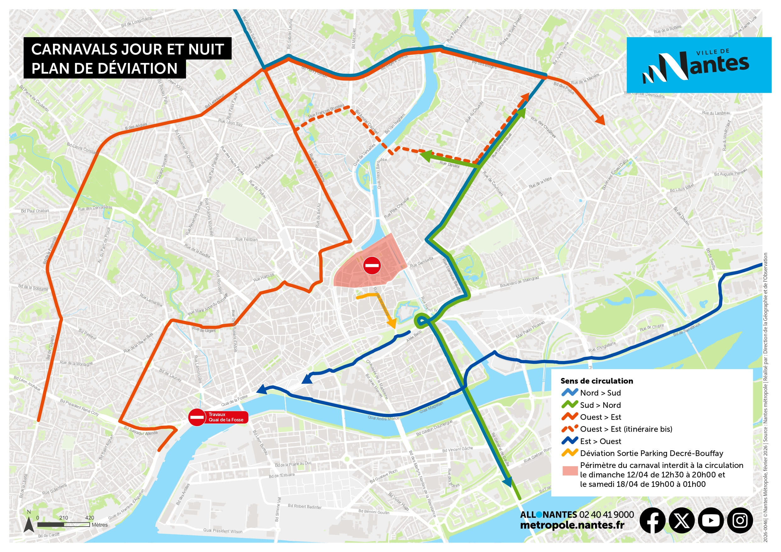 🧭 Parcours défilé centre-ville : départ place du Maréchal-Foch. Puis rue Sully, quai Ceineray, port Communeau, place Lenôtre, cours des 50-Otages, rue de la Mairie, rue de l’Évêché et retour place du Maréchal-Foch.