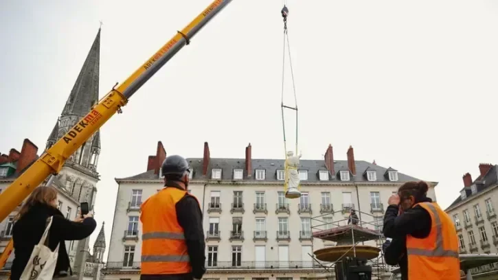 Après des mois de restauration, la figure sommitale de la fontaine, représentant la Ville de Nantes, a retrouvé sa place lundi 19 janvier. Suivent les treize œuvres de bronze mercredi et jeudi. Reportage.