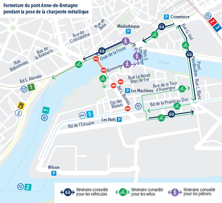 « En tout, l’opération devrait prendre une journée et demie. Elle se déroule en quatre phases. D’abord, la barge va s’approcher du pont Anne-de-Bretagne, à marée haute, pour accrocher des câbles d'amarrage. Cette étape est la plus longue, environ 8 heures. La deuxième phase, la plus spectaculaire, c’est la rotation du pont sur la barge pour l’aligner dans le sens dans lequel il va être posé. Ensuite vient la phase la plus sensible : se rapprocher du pont existant à 20-30 cm. Là, moins on a de courant, mieux on se porte. Donc cette phase va se faire évidemment au plus proche de l’étale [moment entre deux marées où le courant est nul, NDLR]. C’est très délicat. La dernière phase consiste à contrôler la descente de la barge avec la marée, jusqu’à la pose finale sur les piles et culées du futur pont. »