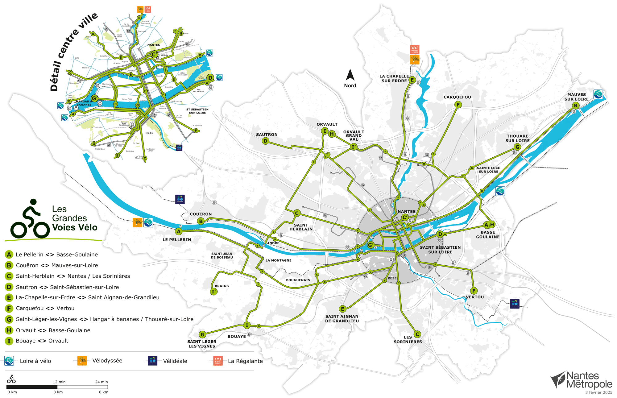 La métropole nantaise compte pas moins de 806 km d’aménagements pour les vélos. Reste à se repérer facilement pour trouver son chemin sans hésitation. Neuf Grandes Voies Vélos (GVV) ont été identifiées et vont être « marquées » de A à I. L’objectif ? Bien mettre en valeur le réseau cyclable existant et faciliter la vie des cyclistes, voire inciter les habitantes et les habitants de la métropole à pédaler d’une commune à l’autre, plutôt que de prendre leur voiture.